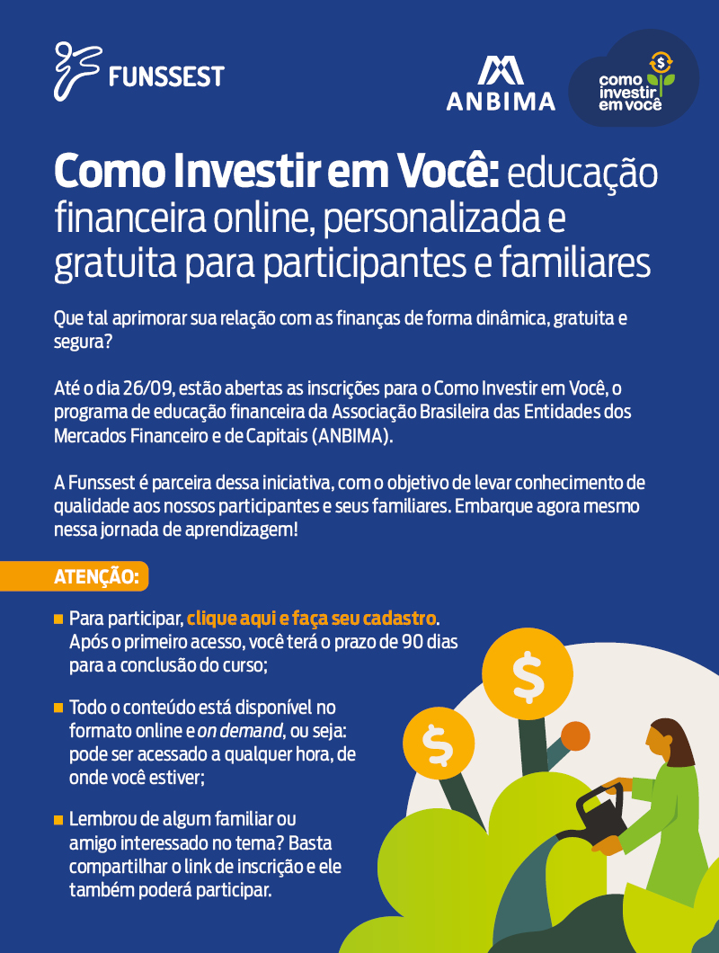 Educação financeira online e gratuita para participantes e familiares: inscreva-se no Como Investir em Você até 26/09