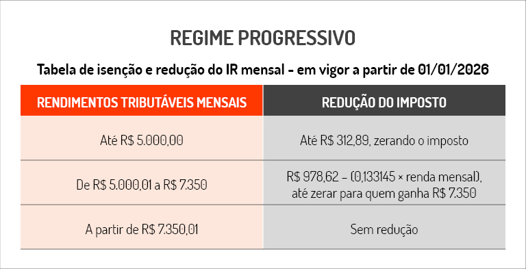 A partir de 01/01/2026, com a vigência da Lei nº 15.270/2025, os contribuintes com rendimentos mensais tributáveis de até R$ 5.000,00 passam a ter a isenção total do IR (somente Regime Progressivo).